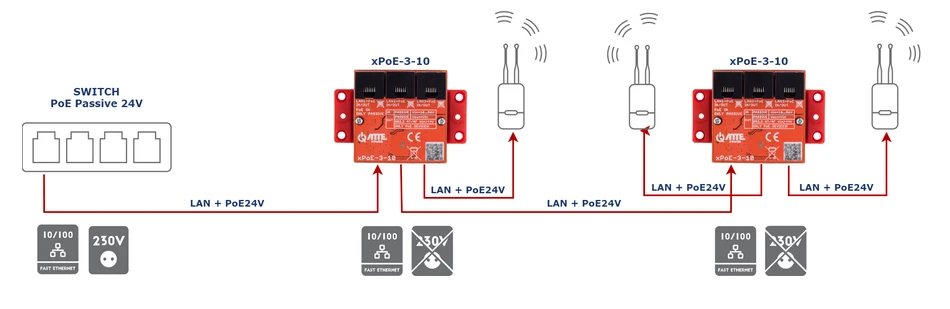 xPoE-3-10 został zaprojektowany jako extender (repeater) sieci LAN oraz zasilania PoE. Regeneruje sygnał sieciowy i przenosi zasilanie PoE na wybrane wyjścia. Najczęściej stosowany jako "wzmacniacz" do przedłużania sieci na odcinkach dłuższych niż 100m. Dodatkowo nadaje się idealnie jako "aktywny rozdzielacz" w sytuacjach, gdy na jednym kablu potrzebujemy uruchomić kilka odbiorników PoE (np. kilka kamer IP), lub gdy potrzebujemy stworzyć dodatkowe odgałęzienie sieciowe. Niezarządzalne switche i extendery PoE przeznaczone są do współpracy z kamerami IP oraz innymi urządzeniami sieciowymi zasilanymi w standardzie PoE 802.3at/af oraz PoE PASSIVE. Przemyślana konstrukcja urządzenia sama w sobie stanowi obudowę. Połączenie laminatu z frezowanym poliwęglanem zapewnia osłonę, izolację przy możliwie jak najmniejszych gabarytach urządzenia. Ustawienie złącz RJ-45 również nie jest przypadkowe - dzięki niemu wpięte kable nie zajmują dodatkowego miejsca